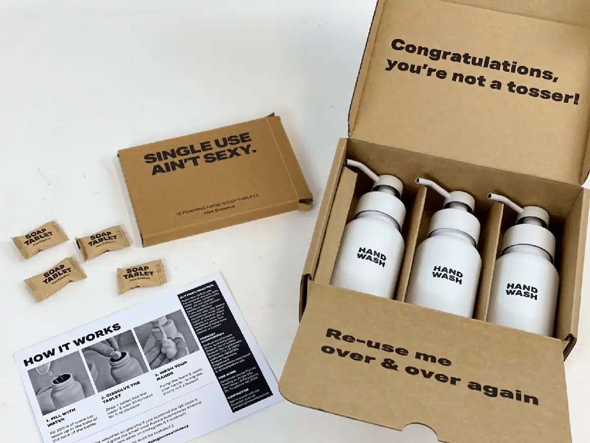 Founded by Josh Howard, Single Use Ain’t Sexy was created to help Australians reduce their single-use plastic bottle consumption without sacrificing style. To achieve this, Howard and his team created Australia’s first ever dissolvable foaming hand soap tablet and reusable glass soap bottle. Every tablet used saves another single-use plastic bottle from landfill, and not shipping water can reduce a person’s carbon footprint by up to 86%. Their solution is simple, sustainable, sexy, and won two Good Design awards – the only thing they were missing was the perfect packaging.
